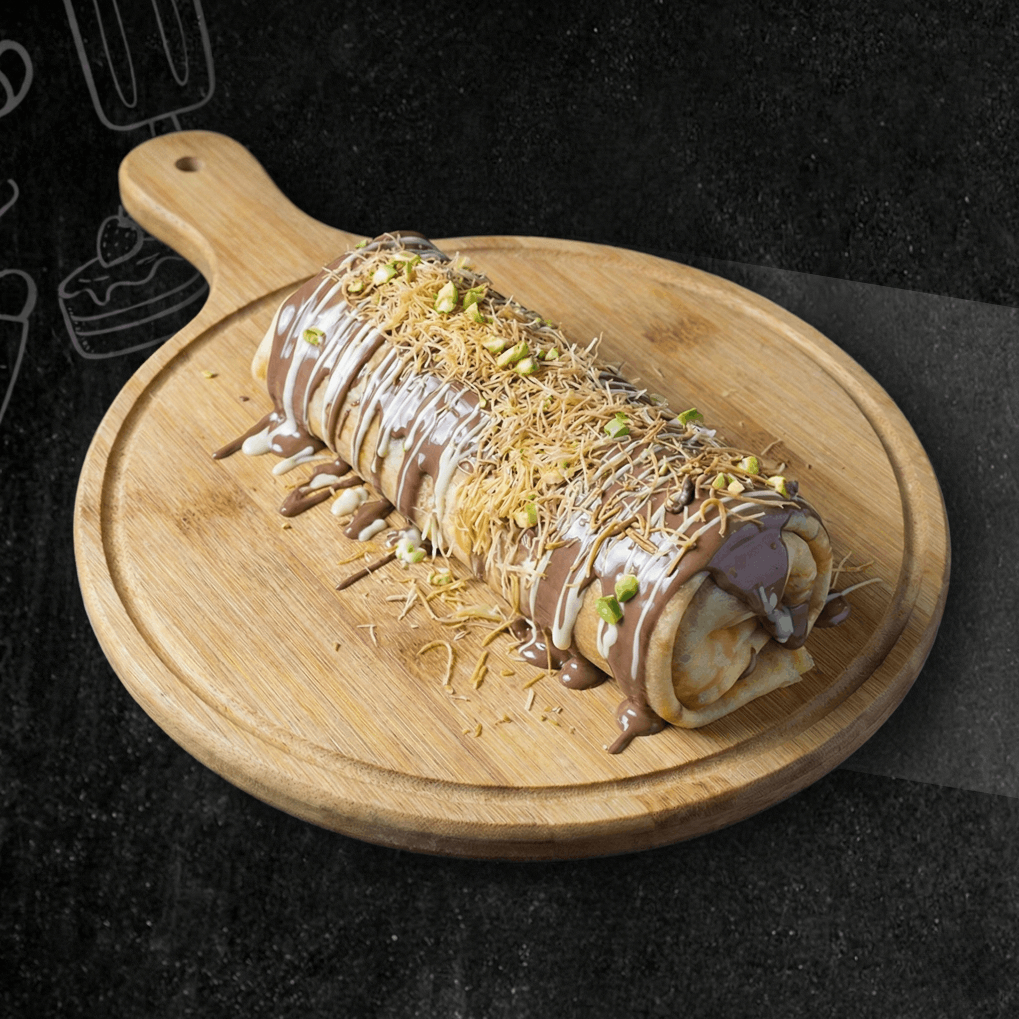 Crepe, Nutella, pistachio cream, white chocolate, katayf